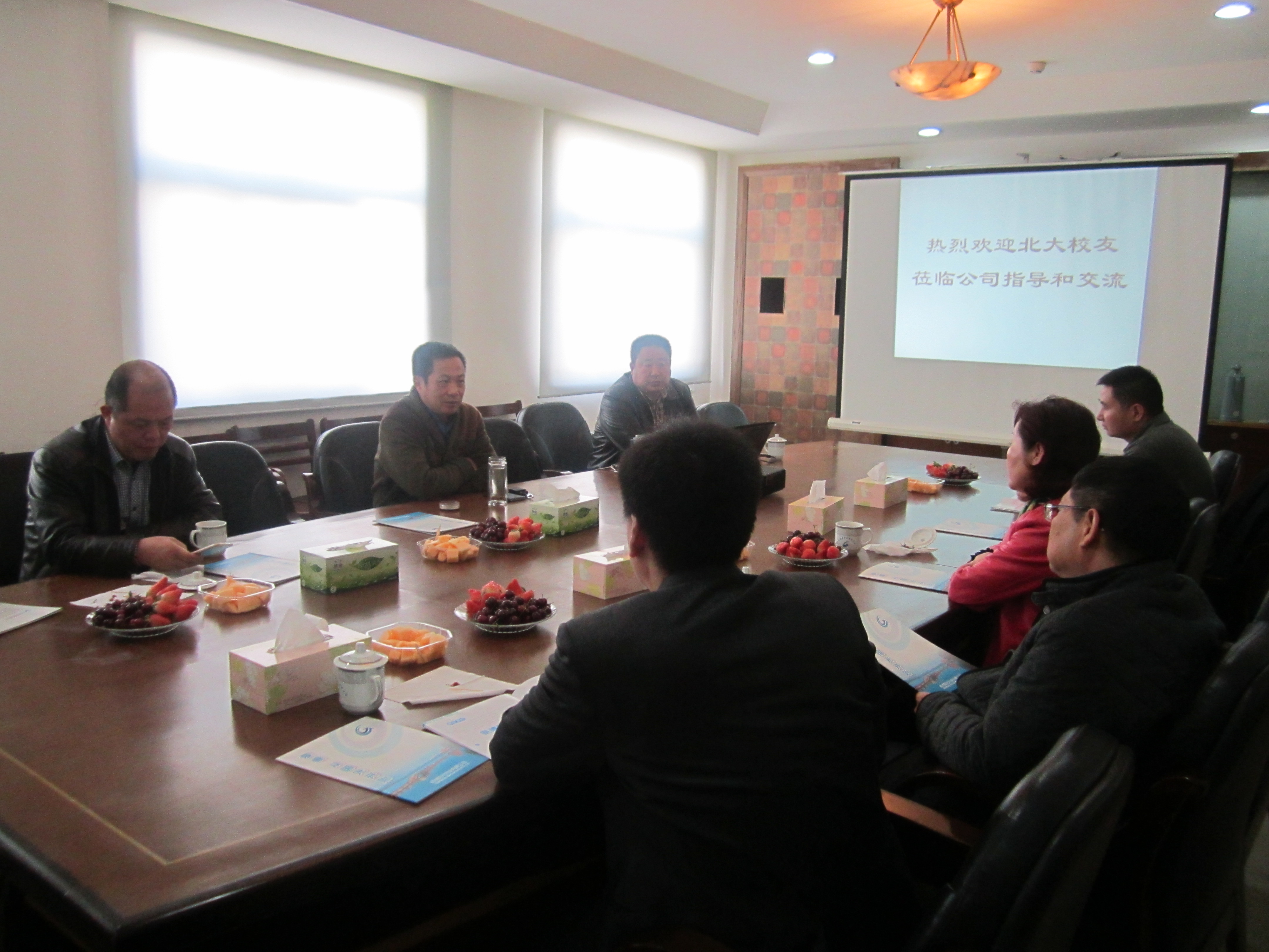 ? ? 2014年12月13日,北大校友蒞臨公司指導(dǎo)和交流,北大校友一行6人,與我司胡董和李總在二樓會(huì)議室商榷企業(yè)事例。