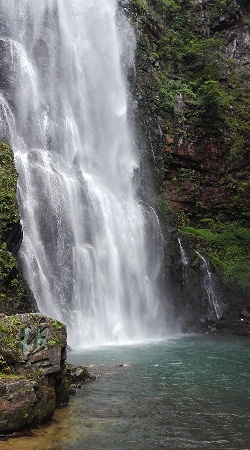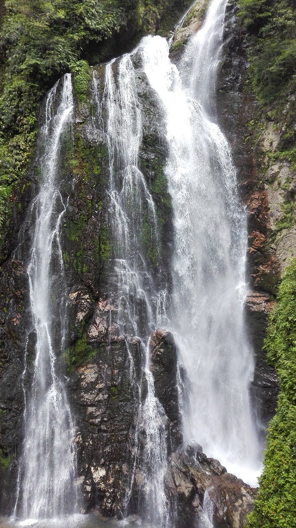 ? ? 飯后,我們就朝著下一景區(qū)前進啦,一段蜿蜒山路過后,我們來到了水口景區(qū),這里有著比龍?zhí)镀俨既焊L,更大的瀑布--彩虹瀑布。不過,考驗我們體力的時刻到啦,為了看到美麗的風景,我們拼了,踏過數(shù)不清的階梯,走過無數(shù)的蜿蜒小道,我們終于來到了彩虹瀑布面前,水汽撲面而來,90幾米長的水簾就在眼前,這一刻的感受真的是太美好了,難以形容啊。