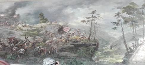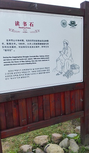 ? ? 第二天醒來,拉開窗簾,又是一個明媚的日子。我們洗洗刷刷,吃完早飯,又元氣十足的出發(fā)啦。而我們今天的第一站則是黃洋界,一進門就是一副巨大的壁畫,這幅壁畫講述了當年紅軍在井岡山奮勇抗戰(zhàn)的過程。這里有一當年紅軍的哨口,當年朱德曾指揮一個營的兵力憑險抵抗國民黨兩個團,并憑借一門小炮獲勝;這里有當年朱德挑糧的小道,真正朱德的扁擔這一故事的發(fā)生地;在這里,我們居然看到了毛主席的扮演者,一時之間還有些激動呢。