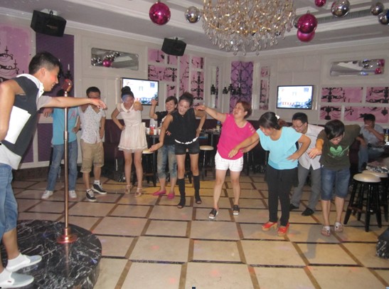 第二環(huán)節(jié),“數(shù)7”游戲,每人依次報數(shù),不得將含有7的數(shù)字,以及7的倍數(shù)念出來,遇到含7或7的倍數(shù),必須用敲桌子代替,不小心念出來的人,就必須為大家獻唱一首歌曲。不過,還記得之前提到的每人分到的題目嗎?沒錯,這個環(huán)節(jié)可以用到這些題目自救并嫁禍于人:不小心數(shù)了7的同事,有一次回答題目的機會,回答正確就可以“嫁禍于人”——任意指定場上一人代替自己接受唱歌的懲罰,當然,每人只能被指定一次。下圖是被嫁禍的同事在唱歌,這個環(huán)節(jié)很多人在幸災樂禍哦!
